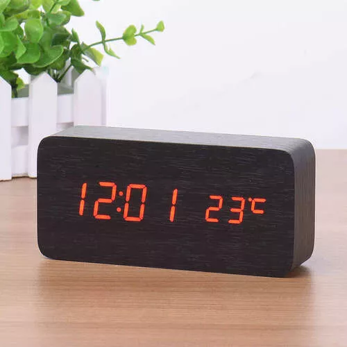 Fa design asztali óra LED kijelzővel - fekete ház piros ledekkel