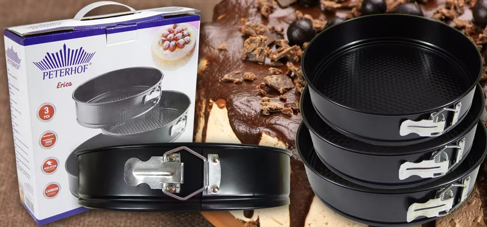 Tulajdonságok: **3 db tortaforma **Anyaga: fém **Átmérő: 22 cm, 24 és 28 cm **Magasság: 6,8 cm **PFOA mentes **Tapadásmentes bevonat **Mosogatógépben mosható