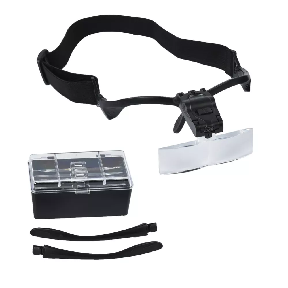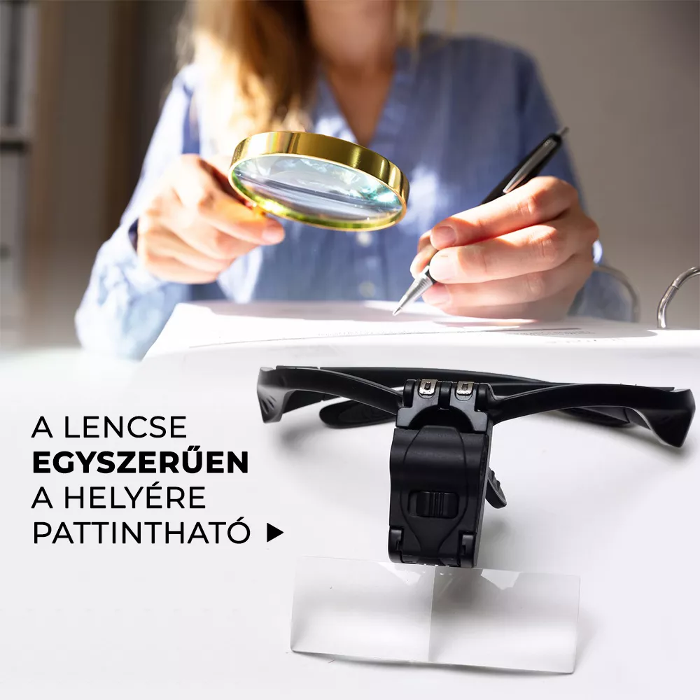 Ez a készlet 5 különböző nagyítású lencsét tartalmaz, melyeket kétféleképpen használhatsz: szemüvegként a mellékelt keretbe csíptetve vagy a szintén a csomag részét képező fejpánt segítségével.