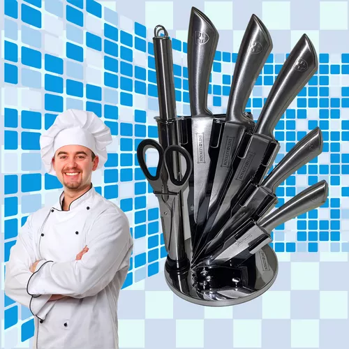 A svájci precizitással kialakított 8 db-os készlet 5 db késből, 1db késélezőből és egy ollóból áll, emellett a szett egy 360 fokos szögben forgatható állványt is tartalmaz. Az állvány igazán praktikus, hiszen szétnyitható, így szükség szerint tudod használni nyitott vagy összezárt formájában is.