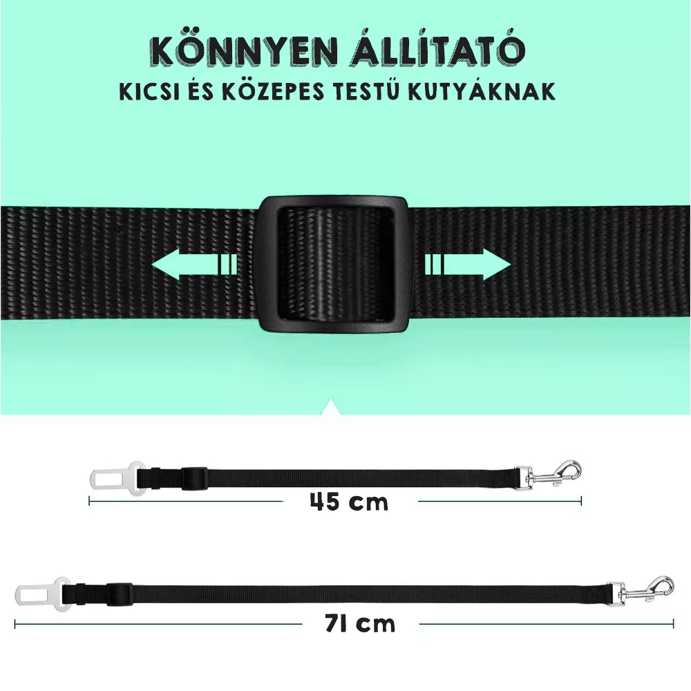 Az öv egyik végén egy övcsat található, ami szinte minden biztonsági övhöz csatlakoztatható, a másik végén pedig egy karabiner, amit a hámra kell rögzíteni. Hossza 45 és 71 cm között állítható, így kutyusod akár ülve, állva vagy fekve is élvezheti az utazást!