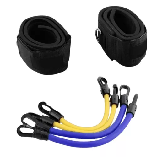 Állóképesség fejlesztő, izomerősítő, ellenállás növelő fitness gumiszalag készlet, tépőzáras pántokkal és gumikötelekkel