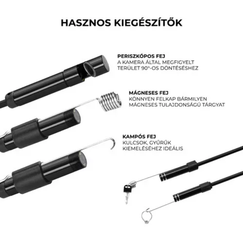 A vékony, 5 mm átmérőjű endoszkópos kamera rugalmas, 10 méter hosszú vezetékkel rendelkezik, mellyel bármilyen résbe, csatornába, csőbe, lefolyóba vagy autó motorterébe könnyedén bepillantást nyerhetsz, a fény 90°-os elhajlítását lehetővé tévő periszkópos segédfejjel pedig akár körbe is nézhetsz a csatorna mélyén.