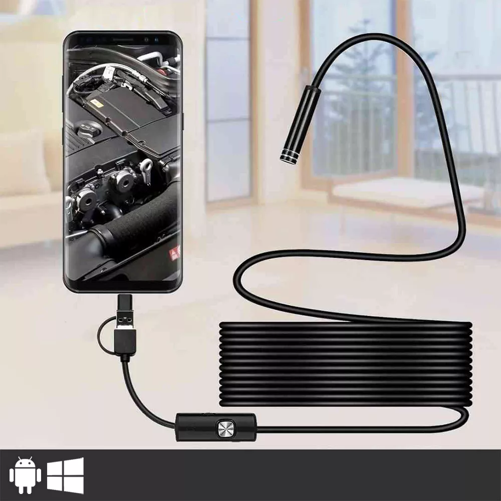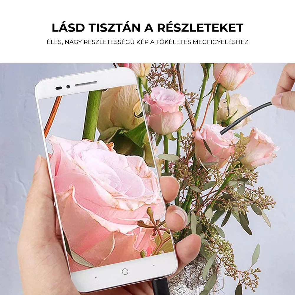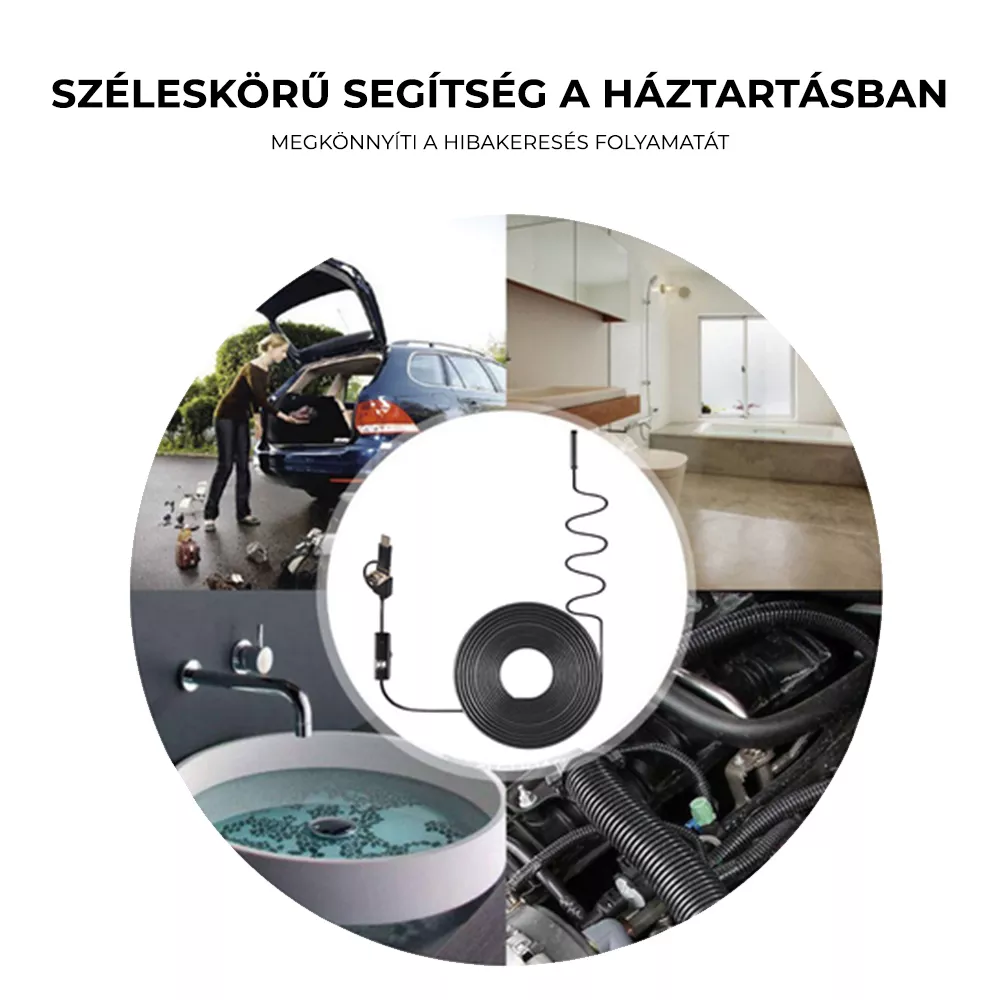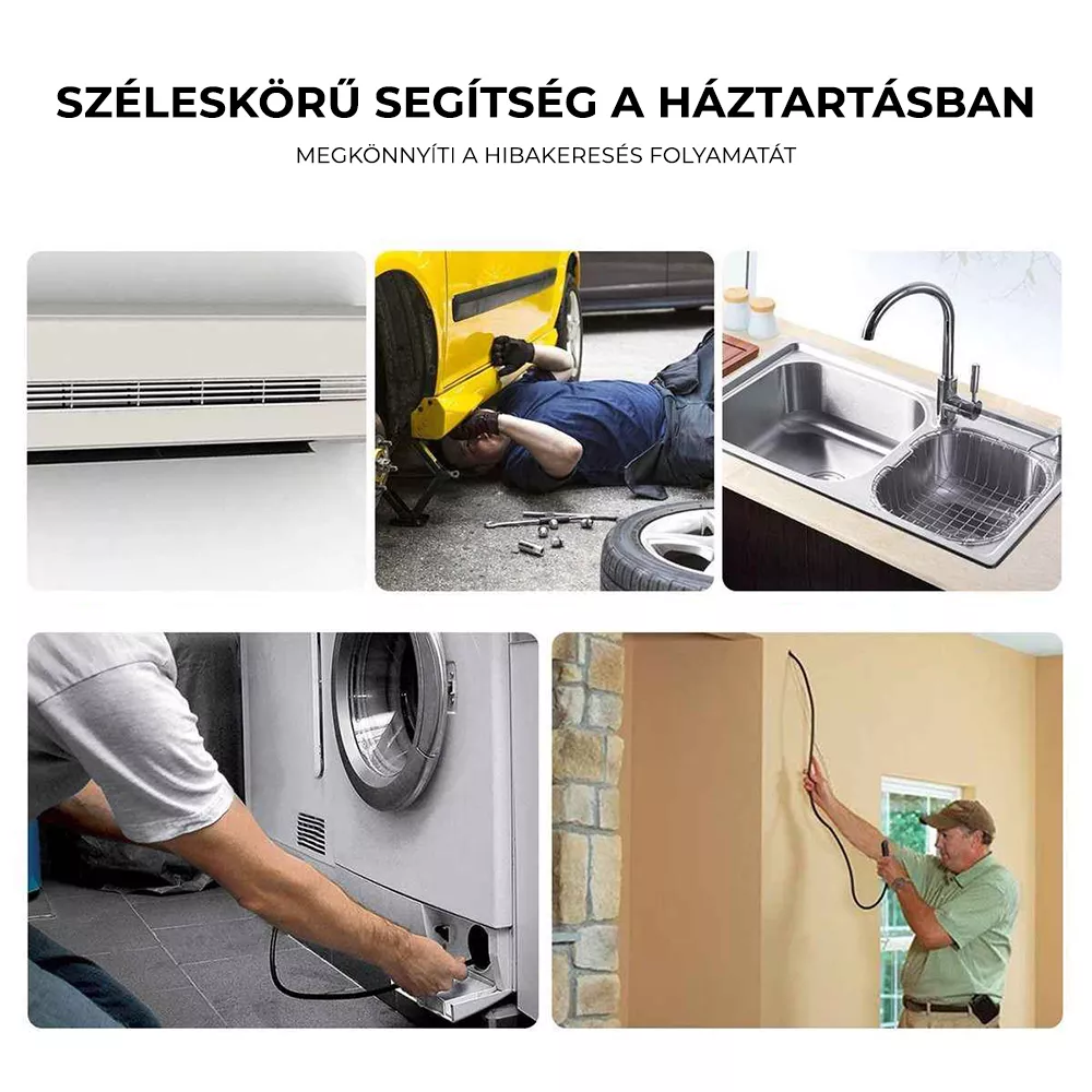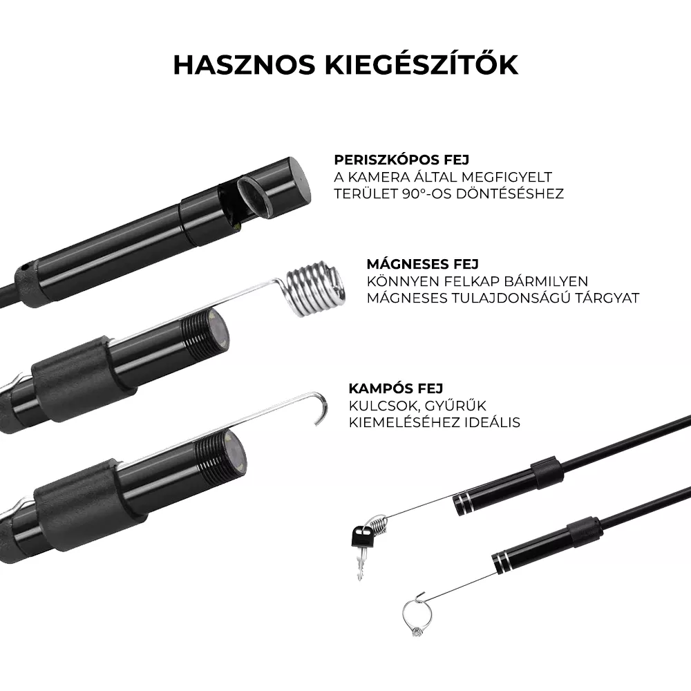 A vékony, 5,5 mm átmérőjű endoszkópos kamera rugalmas, 5 méter hosszú vezetékkel rendelkezik, mellyel bármilyen résbe, csatornába, csőbe, lefolyóba vagy autó motorterébe könnyedén bepillantást nyerhetsz, a fény 90°-os elhajlítását lehetővé tévő periszkópos segédfejjel pedig akár körbe is nézhetsz a csatorna mélyén. Elakadt a kulcsod, a gyűrűd egy szűk, nehezen hozzáférhető helyen? Használd a mágneses és a kampós segédfejeket!