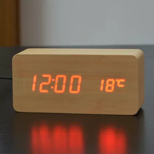 Fa design asztali óra LED kijelzővel - világosbarna ház piros ledekkel