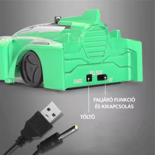 Figyelem! Az autó alján látható fehér ragasztó csíkot ne szedd le, mert az autó nem lesz képes a falon közlekedni! Szőnyegen nem használható, homoktól, poros helyektől távol tartandó. Az autót fontos sűrű időközönként (7-9 perc) tölteni, mert merülőfélben már nem marad fent a falon. Az autó csak kikapcsolt állapotában töltődik!