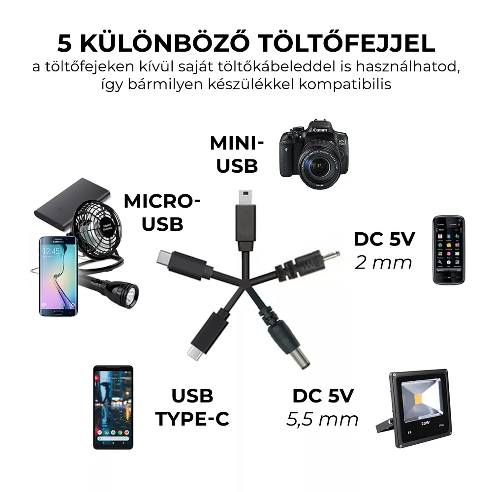 **5 különböző töltőfejjel felszerelt USB‑kábel (microUSB, USB Type‑C, miniUSB, DC 5V 2,0 mm, DC 5V 5,5 mm)