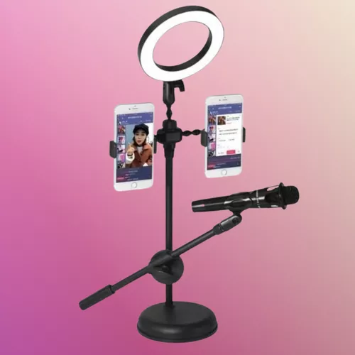 Influencer telefon + mikrofon + selfie állvány led körfény + 2 db telefontartó + táv