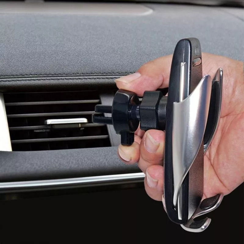 Intelligens autós telefontartó + Qi töltő, szellőzőrácsba illeszthető