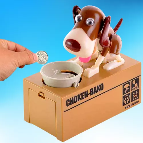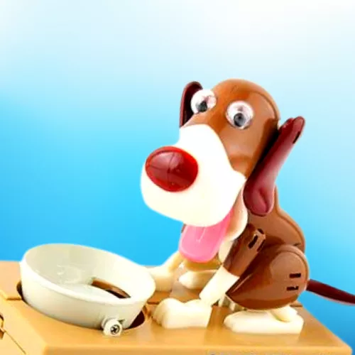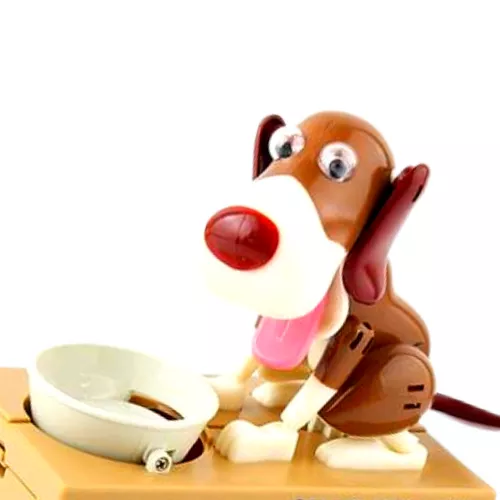 Etetőtálja egy pénzesdoboz tetején helyezkedik el és örül minden érmének amit megtakarítasz. Helyezz a tálba fémpénzt, a kutyus pedig vidáman a tál fölé hajol mintha megenné az érmét, ami ezután eltűnik a tál alá rejtett pénzesdobozban.