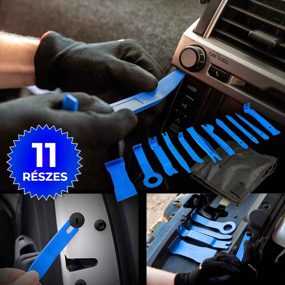 A készlet kárpitok, díszlécek, tömítések, kapcsolók stb. biztonságos eltávolításához, a műszerfal szétszereléséhez használható. 11 különböző alakú, vastagságú és rugalmasságú eszközt tartalmaz, melyek között biztosan megtalálod azt, amelyikre az aktuális munkafolyamathoz épp szükséged van.