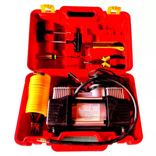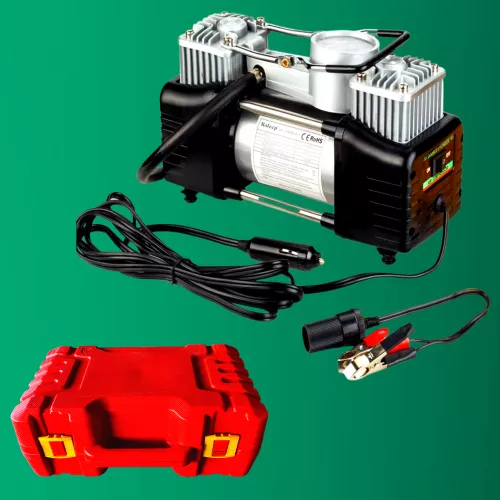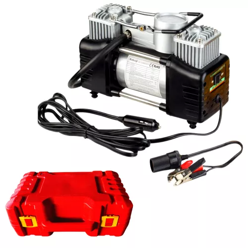 Kétdugattyús légkompresszor - labda, matrac, kerék elektromos pumpa + kerékjavító készlet - szivargyújtó + 12V