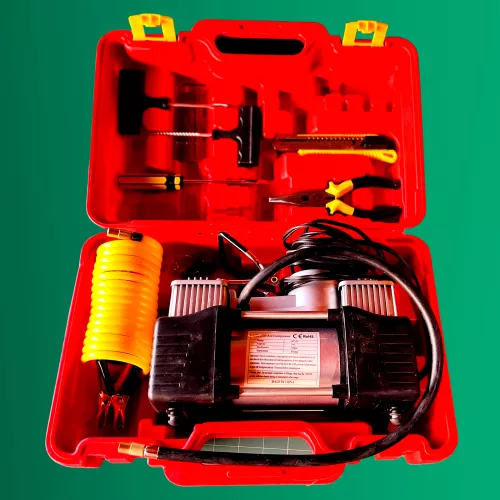 Az ütéscsillapító, rugalmas, műanyagötvözetből készült táskában találsz egy kétdugattyús légnyomáskijelzővel ellátott légkompresszort, melyet szivargyújtó csatlakozóról vagy a krokodilcsipeszes csatlakozó segítségével bármilyen 12V-os áramforrásról működtethetsz, 12V krokodilcsipeszeket, egy rugalmas levegőtovábbító csatlakozót, 3 féle adaptert a különböző típusú szelepekhez, 1 csomag gumitömítő pasztát, gumiragasztót, 2db gumijavító szerszámot, 1db vágókést letörhető pengével, 1db laposfejű közepesméretű csavarhúzót, 1db kombinált fogót.