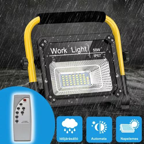 Napelemes hordozható LED reflektor 50W + távirányító + lapracsukható