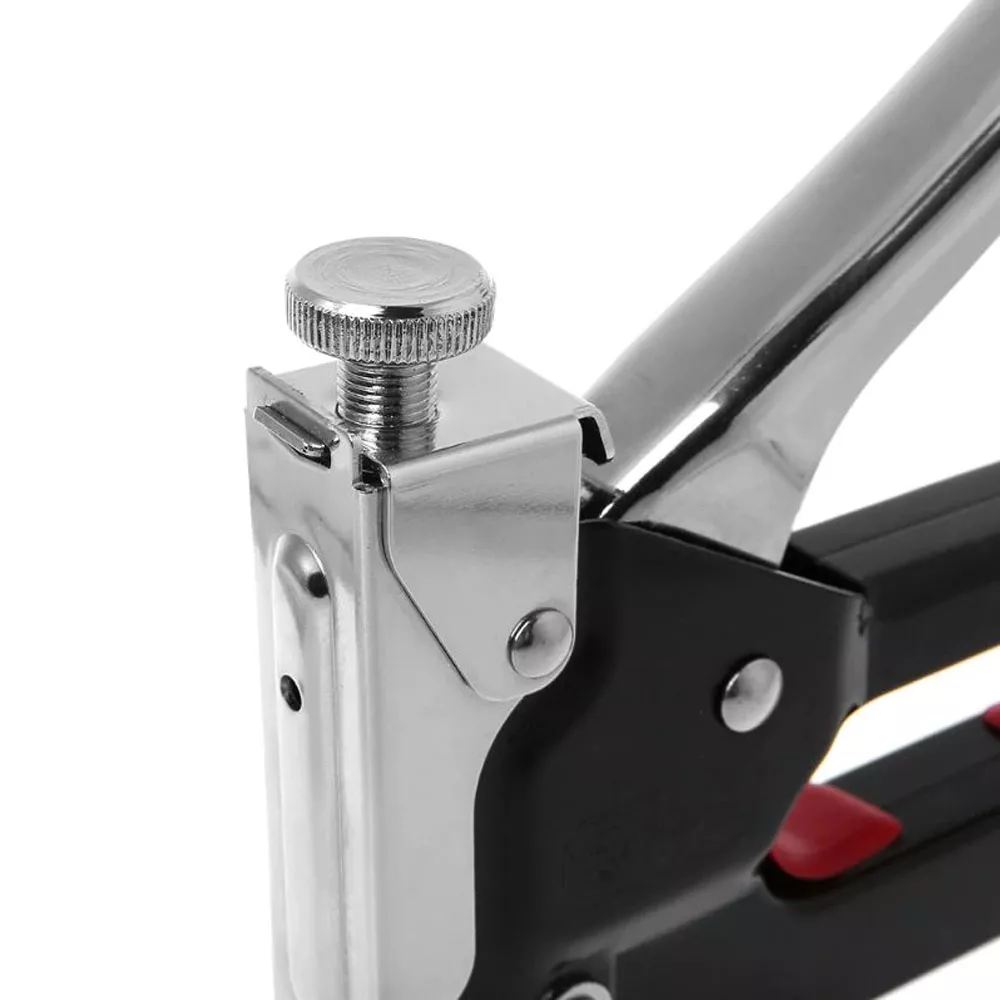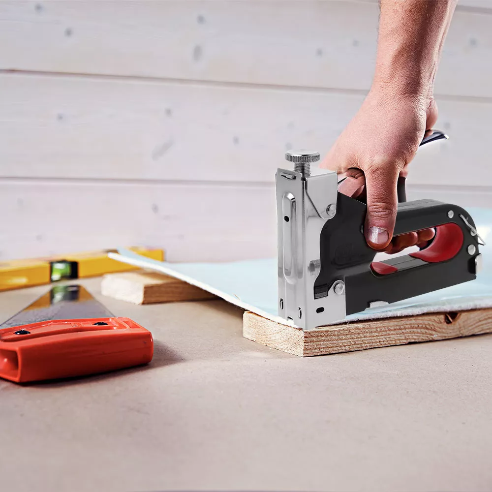 A tűzőgépen látható csavar az ütés erejének beállítására szolgál – a rögzítés erősségének és az anyag keménységének megfelelően. Gumírozott markolata ergonomikus és biztonságos fogást tesz lehetővé.