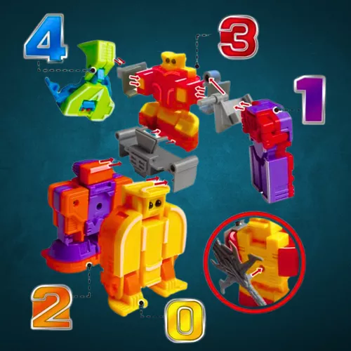 Minden szám egyenként különböző robottá alakítható, de a mellékelt kiegészítő segítségével a figurákat összeilletve egy nagy harcos robotot is készíthet, amihez egy kard is tartozik.