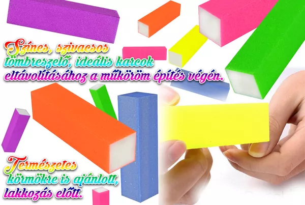 A szett 10 db különböző színű, szivacsos téglatestet tartalmaz, amely egyaránt használható a műköröm építés befejezésekor, a reszelő okozta karcolások eltüntetéséhez, és természetes körmökön is, egyenletes körömfelület csiszolásához, körömlakkok, vagy géllakkok használata előtt.