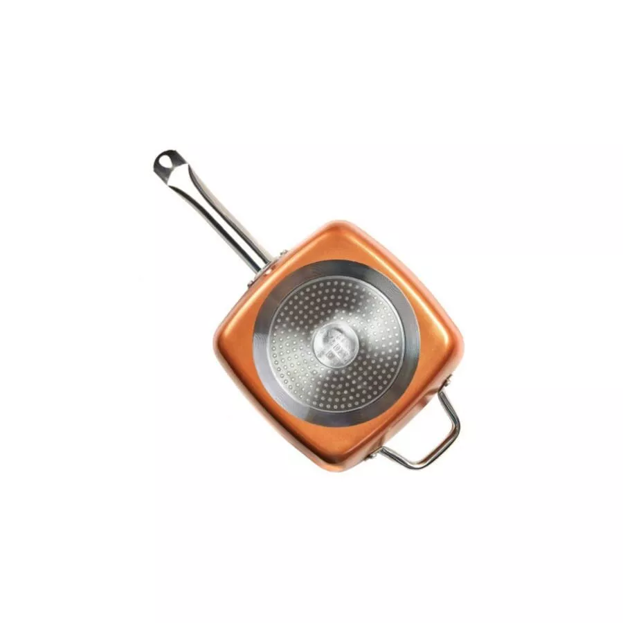 Ez a kerámiából és strapabíró rézből készült serpenyő forradalmian új tapadásmentes technológiával készült - emiatt a legkeményebb próbákat is kiállja! Magas fala meggátolja a kifröccsenő olajfoltokat, így nem csupán a serpenyőt egyszerű tisztítani, de megkímélheted magad a sütőben lerakódott mocsok kitakarításától is. Az extra nagy főzőfelület alján elhelyezkedő alumínium gyűrű biztosítja az egyenletes hőelosztást, így ételei tökéletesen átsülnek minden irányból.
