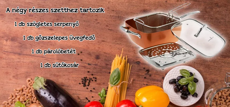 **4 részes szett: szögletes serpenyő, üvegfedő (gőzszeleppel), párolóbetét, sütőkosár