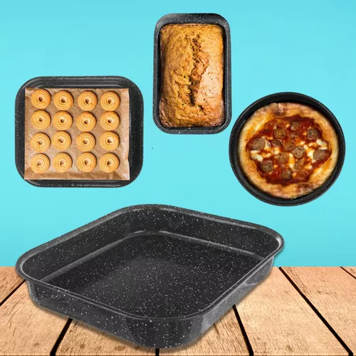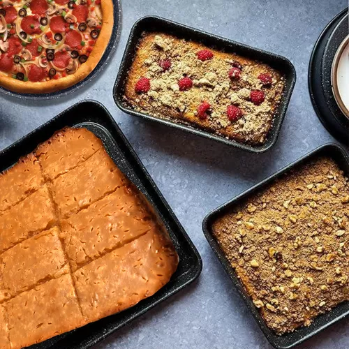 Ebben a praktikus készletben találsz egy cipó formát, egy nagyobb és egy kisebb tepsit és egy kerek alakú sütőformát torták, sütemények készítéséhez, vagy pizza sütéshez.