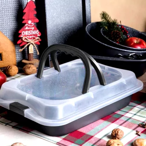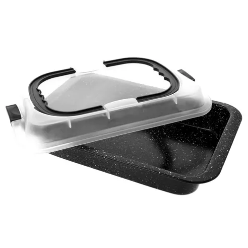 Tapadásmentes tepsi átlátszó műanyag tetővel, hordozható sütőtál, kínáló tálca, 36 x 24,5 cm